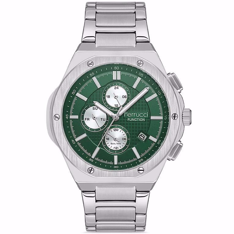 این طرح از برند ساعت مردانه فروچی با طراحی خاص خود هم برای تیپهای مجلسی و هم روزمره و اسپرت بسیار مناسب میباشد. بند و بدنه ی این ساعت فروچی از جنس استیل است و از رنگهای نقره ای و سبز در آن استفاده شده است. از ویژگیهای منحصر به فرد این ساعت میتوان به طراحی ساده ی ساعت اشاره کرد که برای تیپهای مجلسی و روزمره بسیار مناسب میباشد و همچنین طراحی صفحه ی این طرح از ساعت فروچی بسیار ساده و شیک است که چشم هر بیننده ای را خیره میکند. همچنین این ساعت تقویم دار بوده و دارای نمایشگر روزهای ماه و هفته و نمایشگر وضعیت 24 ساعته است. این ساعت فروچی دو زمانه میباشد.