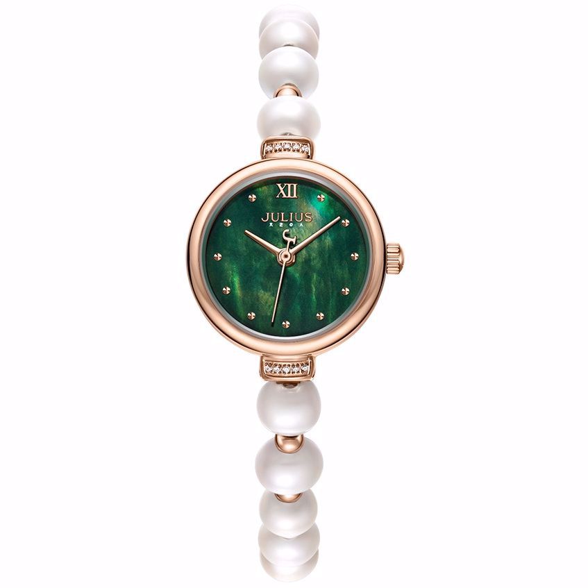 این طرح از برند ساعت جولیوس با طراحی خاص خود برای تیپهای مجلسی و روزمره بسیار مناسب میباشد. بند و بدنه ی این ساعت جولیوس از جنس استیل و تکه های مرواریدی است و از رنگ های رزگلد و سفید و سبز در آن استفاده شده است. از ویژگیهای منحصر به فرد این ساعت میتوان به طراحی خاص ساعت اشاره کرد که برای تیپهای مجلسی بسیار مناسب میباشد و همچنین طراحی صفحه ی این طرح از ساعت جولیوس بسیار متفاوت و شیک و به صورت صدفی با رنگ خاص سبز است که چشم هر بیننده ای را خیره میکند. همچنین نگین های استفاده شده در این ساعت از نگین های سواروسکی میباشد که ارزش و زیبایی آن را دوچندان کرده است. بند و بدنه ی این ساعت از جنس استیل 316L میباشد و کاملا رنگ ثابت میباشد و دارای یک سال گارانتی شرکتی است. این ساعت به همراه جعبه و دفترچه گارانتی خدمت شما عزیزان ارسال میشود.