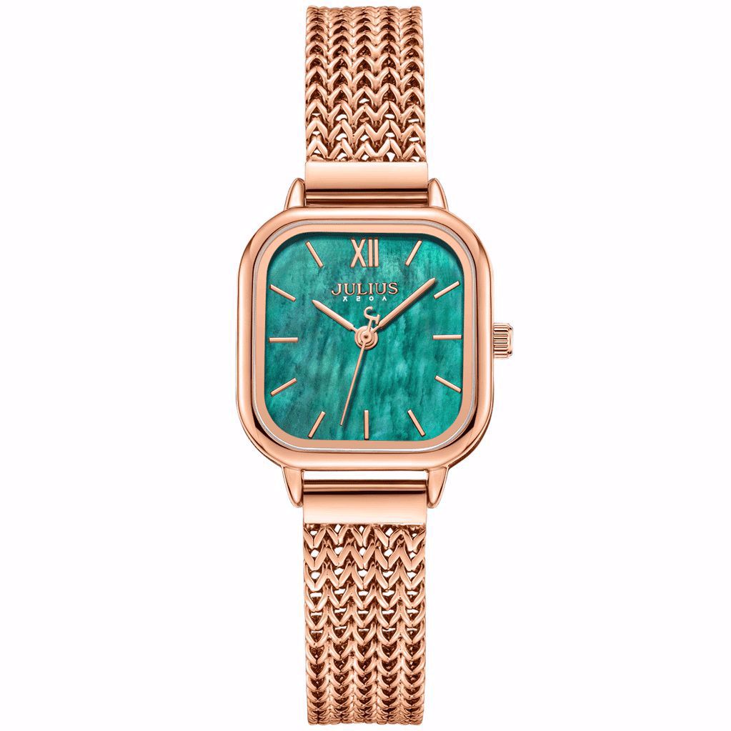 این طرح از برند ساعت جولیوس با طراحی خاص خود برای تیپهای مجلسی و روزمره بسیار مناسب میباشد. بند و بدنه ی این ساعت جولیوس از جنس استیل است و از رنگ های رزگلد و سبز در آن استفاده شده است. از ویژگیهای منحصر به فرد این ساعت میتوان به طراحی ساده ی ساعت اشاره کرد که برای تیپهای مجلسی بسیار مناسب میباشد و همچنین طراحی صفحه ی این طرح از ساعت جولیوس صدفی بوده و بسیار متفاوت و شیک است که چشم هر بیننده ای را خیره میکند.