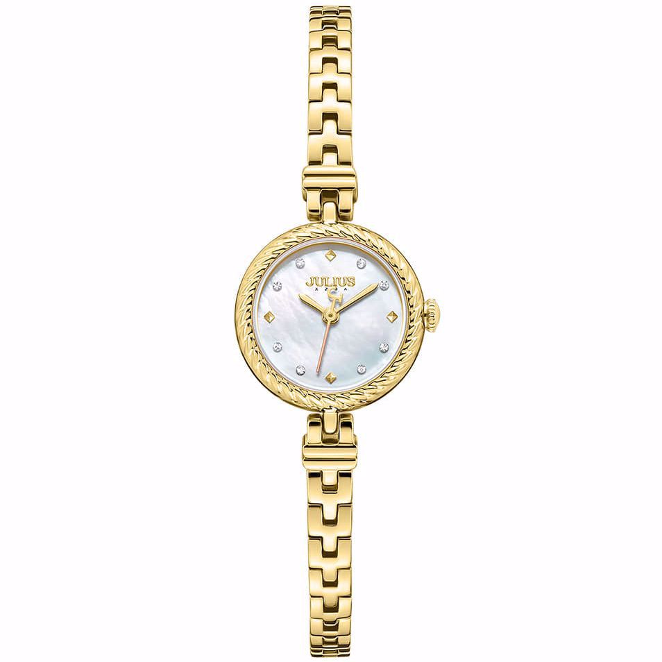 این طرح از برند ساعت جولیوس با طراحی خاص خود برای تیپهای مجلسی و روزمره بسیار مناسب میباشد. بند و بدنه ی این ساعت جولیوس از جنس استیل است و از رنگ طلایی در آن استفاده شده است. از ویژگیهای منحصر به فرد این ساعت میتوان به طراحی ساده ی ساعت اشاره کرد که برای تیپهای مجلسی بسیار مناسب میباشد و همچنین طراحی صفحه ی این طرح از ساعت جولیوس بسیار متفاوت و شیک و صدفی است که چشم هر بیننده ای را خیره میکند. همچنین نگین های استفاده شده در این ساعت از نگین های سواروسکی میباشد که ارزش و زیبایی آن را دوچندان کرده است.
