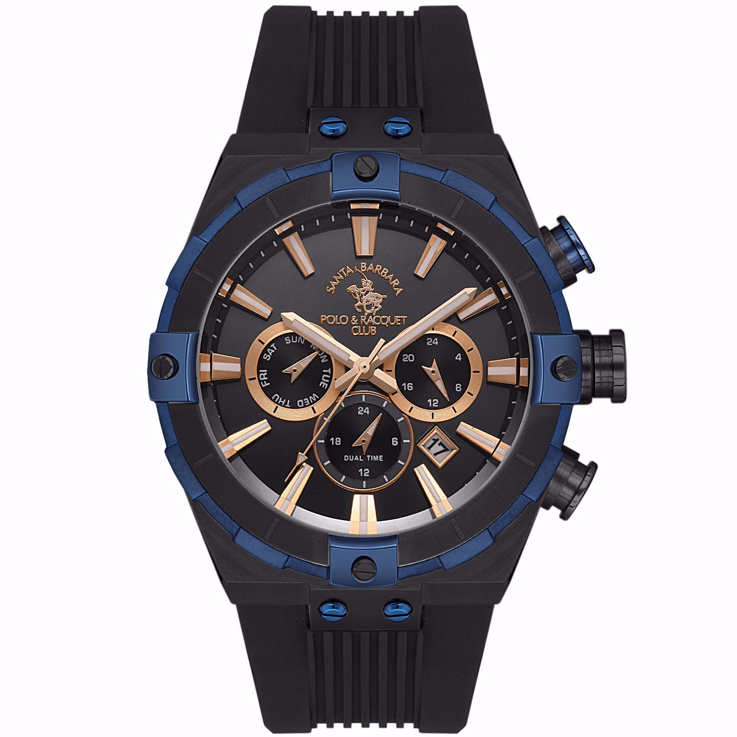 این طرح از برند ساعت پولو سانتا باربارا با طراحی خاص خود برای تیپهای اسپرت و نیمه اسپرت بسیار مناسب میباشد. بند این ساعت پولو از جنس رابر یا پلاستیک فشرده و نرم و بدنه ی آن از جنس استیل است و از رنگهای مشکی و سرمه ای و رزگلد در آن استفاده شده است. از ویژگیهای منحصر به فرد این ساعت میتوان به طراحی زمخت و اسپرت ساعت اشاره کرد که برای تیپهای اسپرت و روزمره بسیار مناسب میباشد و از طرفی نیز سه موتوره بودن آن که حالت اسپرتی به ساعت بخشیده است. همچنین این طرح از برند پولو دارای نمایشگر روزهای ماه و هفته و وضعیت 24 ساعته بوده و دو تایمه بوده و دو ساعت را به صورت همزمان نمایش میدهد. عقربه ها و ایندکس های ساعت نیز کاملا شبنما میباشند و در تاریکی به راحتی قابل خواندن است.