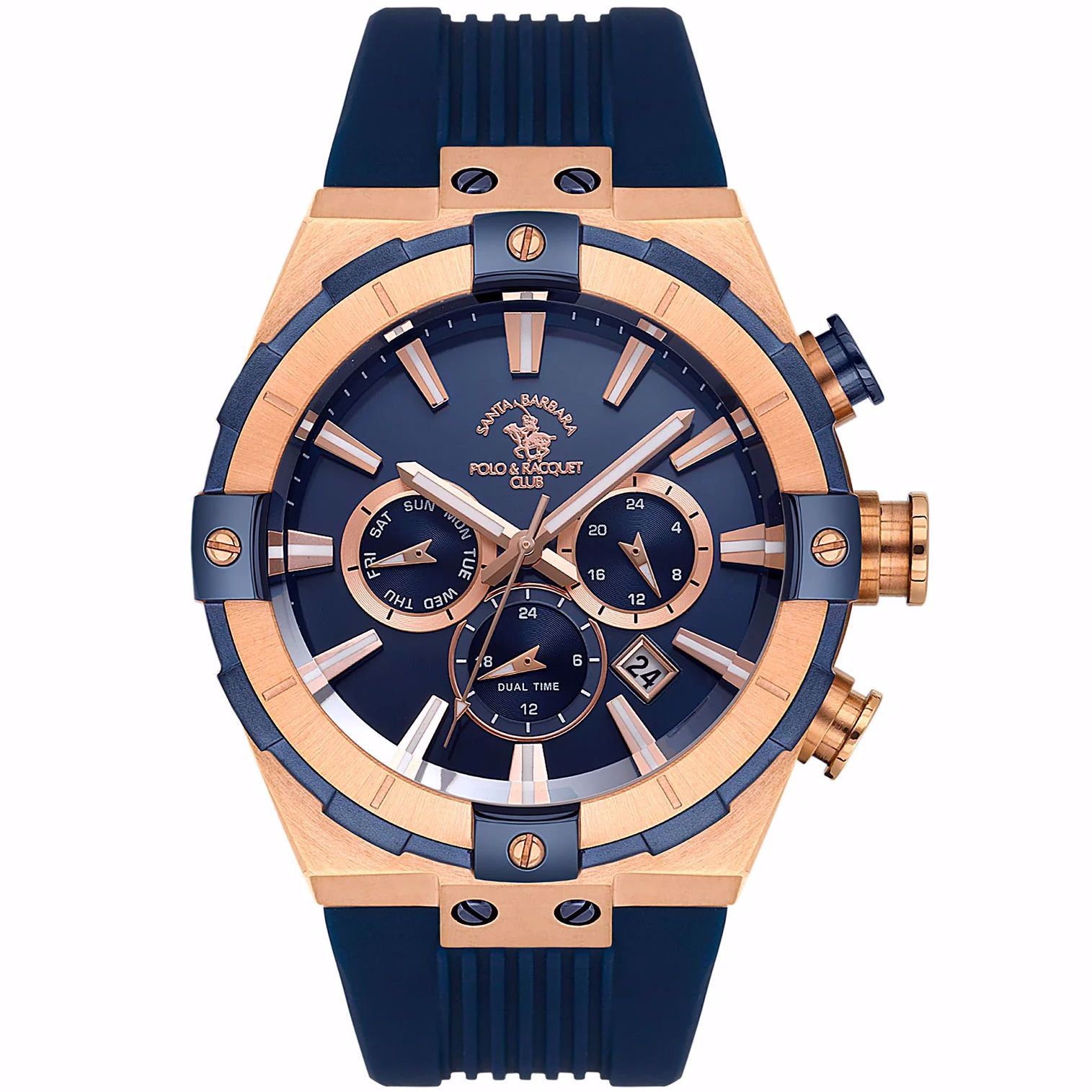 این طرح از برند ساعت پولو سانتا باربارا با طراحی خاص خود برای تیپهای اسپرت و نیمه اسپرت بسیار مناسب میباشد. بند این ساعت پولو از جنس رابر یا پلاستیک فشرده و نرم و بدنه ی آن از جنس استیل است و از رنگهای سرمه ای و رزگلد در آن استفاده شده است. از ویژگیهای منحصر به فرد این ساعت میتوان به طراحی زمخت و اسپرت ساعت اشاره کرد که برای تیپهای اسپرت و روزمره بسیار مناسب میباشد و از طرفی نیز سه موتوره بودن آن که حالت اسپرتی به ساعت بخشیده است. همچنین این طرح از برند پولو دارای نمایشگر روزهای ماه و هفته و وضعیت 24 ساعته بوده و دو تایمه بوده و دو ساعت را به صورت همزمان نمایش میدهد. عقربه ها و ایندکس های ساعت نیز کاملا شبنما میباشند و در تاریکی به راحتی قابل خواندن است.
