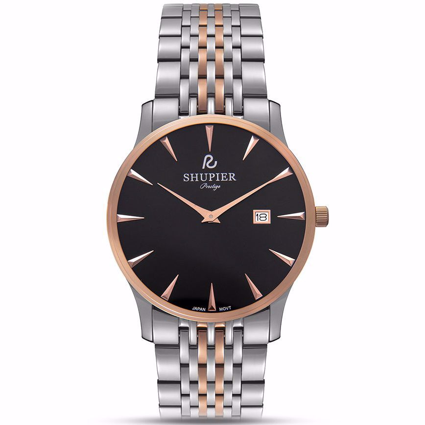 این ساعت مچی مردانه از برند شوپییر بوده و جنس بند و بدنه ی آن استیل آنتی آلرژی و ضد حساسیت می باشد که از ترکیب رنگ های نقره ای و رزگلدو مشکی در آن استفاده شده است. سادگی در ساعت های شوپییر کاملا مشهود است و به شکلی زیبا از این سادگی در ساعتهای شوپییر استفاده شده که چشم هر بیننده ای را به خود جلب میکنند. همچنین دارای نمایشگر روزهای ماه میباشد.