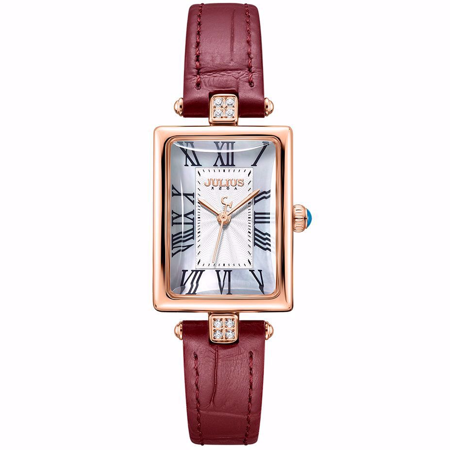 این طرح از برند ساعت جولیوس با طراحی خاص خود برای تیپهای مجلسی و روزمره بسیار مناسب میباشد. بند این ساعت جولیوس چرمی و بدنه ی آن از جنس استیل است و از رنگ های رزگلد و زرشکی در آن استفاده شده است. از ویژگیهای منحصر به فرد این ساعت میتوان به طراحی زیبای بدنه ی ساعت اشاره کرد که به صورت مستطیلی و بسیار خاص بوده و برای تیپهای مجلسی بسیار مناسب میباشد و همچنین طراحی صفحه ی این طرح از ساعت جولیوس بسیار متفاوت و شیک و به صورت اعداد رومی است که چشم هر بیننده ای را خیره میکند. نگینهای استفاده شده در این مدل از جنس سنگ سوواروسکی میباشند. شیشه ی ساعت نیز به صورت محدبی و بسیار چشم نواز است. بدنه ی این ساعت از جنس استیل 316L میباشد و کاملا رنگ ثابت میباشد و دارای یک سال گارانتی شرکتی است. این ساعت به همراه جعبه و دفترچه گارانتی خدمت شما عزیزان ارسال میشود.