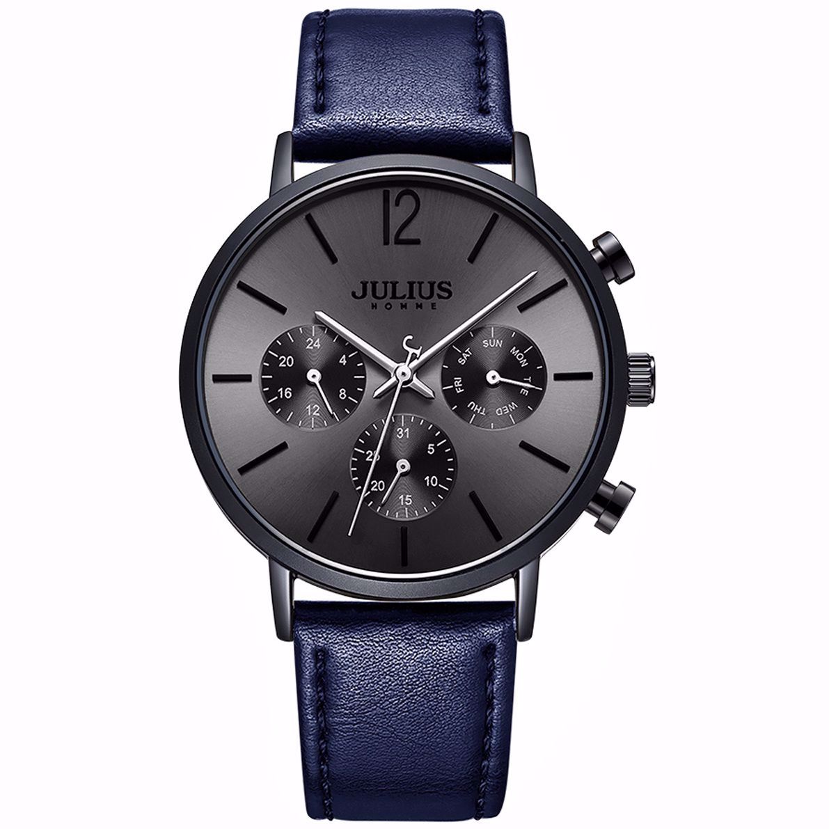 این طرح از برند ساعت جولیوس با طراحی خاص خود برای تیپهای مجلسی و روزمره بسیار مناسب میباشد. بند چرمی و بدنه ی این ساعت جولیوس از جنس استیل است و از رنگ سرمه ای و مشکی در آن استفاده شده است. از ویژگیهای منحصر به فرد این ساعت میتوان به طراحی ساده ی ساعت اشاره کرد که برای تیپهای مجلسی بسیار مناسب میباشد و همچنین طراحی صفحه ی این طرح از ساعت جولیوس بسیار متفاوت و شیک است که چشم هر بیننده ای را خیره میکند. این ساعت دارای نمایشگر روزهای ماه و هفته و وضعیت 24 ساعته میباشد.