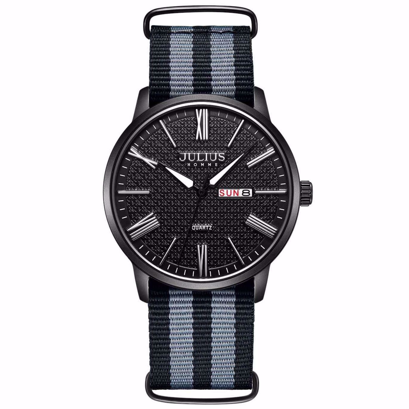 این طرح از برند ساعت جولیوس با طراحی خاص خود برای تیپهای روزمره بسیار مناسب میباشد. بند برزنتی و بدنه ی این ساعت جولیوس از جنس استیل است و از رنگ مشکی و طوسی در آن استفاده شده است. از ویژگیهای منحصر به فرد این ساعت میتوان به طراحی ساده ی ساعت اشاره کرد که برای تیپهای روزمره بسیار مناسب میباشد و همچنین طراحی صفحه ی این طرح از ساعت جولیوس بسیار متفاوت و ساده و شیک است که چشم هر بیننده ای را خیره میکند. این ساعت دارای نمایشگر روزهای ماه و هفته میباشد.