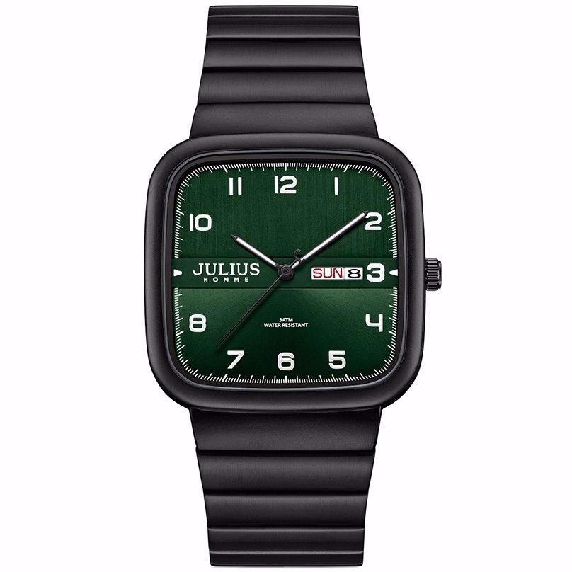 این طرح از برند ساعت جولیوس با طراحی خاص خود برای تیپهای مجلسی و روزمره بسیار مناسب میباشد. بند و بدنه ی این ساعت جولیوس از جنس استیل است و از رنگ های مشکی و سبز در آن استفاده شده است. از ویژگیهای منحصر به فرد این ساعت میتوان به طراحی ساده ی ساعت اشاره کرد که برای تیپهای مجلسی بسیار مناسب میباشد و همچنین طراحی بدنه ی این طرح از ساعت جولیوس بسیار متفاوت و شیک و به صورت مربعی است که چشم هر بیننده ای را خیره میکند. این ساعت دارای نمایشگر روزهای ماه و هفته میباشد و همچنین شبنما است. بند و بدنه ی این ساعت از جنس استیل 316L میباشد و کاملا رنگ ثابت میباشد و دارای یک سال گارانتی شرکتی است. این ساعت به همراه جعبه و دفترچه گارانتی خدمت شما عزیزان ارسال میشود.