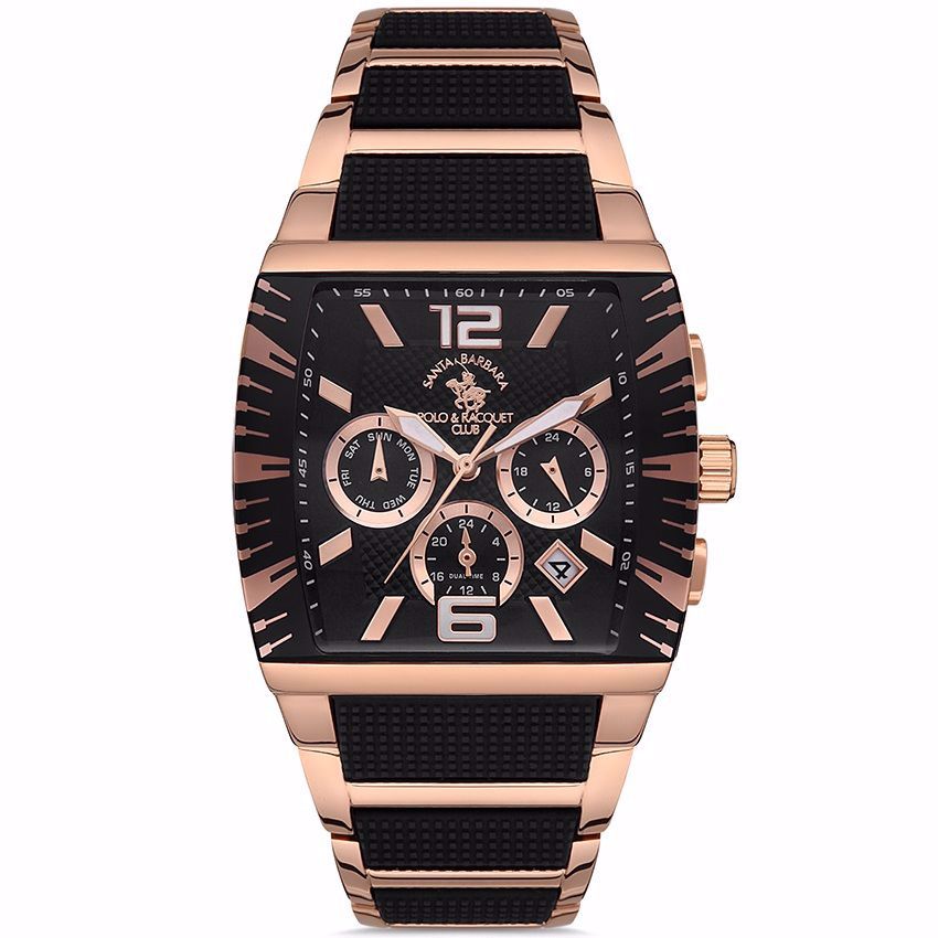 این طرح از برند ساعت پولو سانتا باربارا با طراحی خاص و صفحه ی مستطیلی برای تیپهای اسپرت و نیمه مجلسی بسیار مناسب میباشد. بدنه ی این ساعت پولو از جنس استیل و بند آن ترکیب رابر و استیل است و از رنگ های مشکی و رزگلد در آن استفاده شده است. سه موتوره بودن آن حالت اسپرتی به ساعت بخشیده است. همچنین این طرح از برند پولو دارای نمایشگر روزهای ماه و هفته و وضعیت 24 ساعته و دو زمانه میباشد.