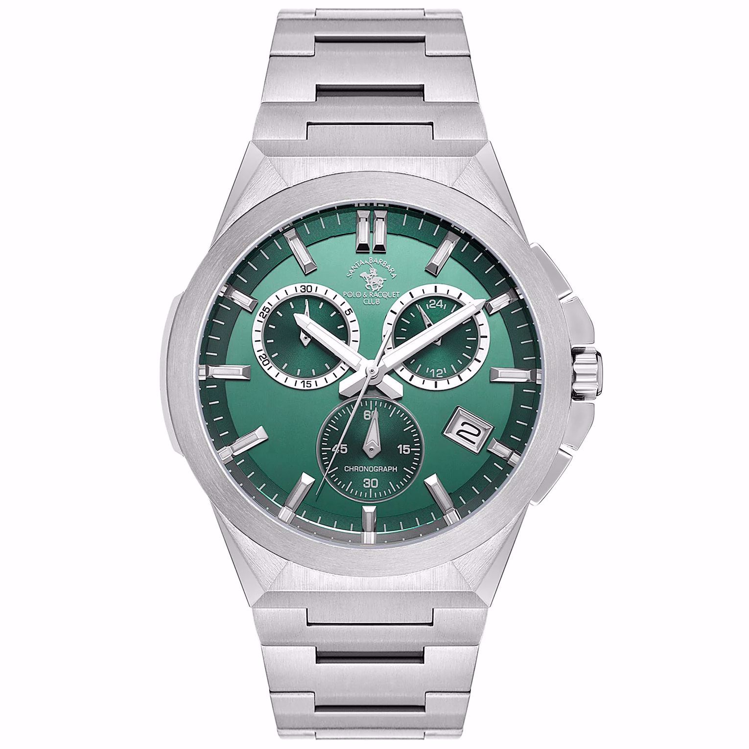 این طرح از برند ساعت پولو سانتا باربارا با طراحی خاص خود برای تیپهای اسپرت و نیمه مجلسی بسیار مناسب میباشد. بند این ساعت پولو و بدنه ی آن از جنس استیل است و از رنگهای نقره ای و سبز در آن استفاده شده است. از ویژگیهای منحصر به فرد این ساعت میتوان به طراحی ساده ی ساعت اشاره کرد که برای تیپهای مجلسی و رسمی بسیار مناسب میباشد و از طرفی نیز سه موتوره بودن آن حالت اسپرتی به ساعت بخشیده است. همچنین این طرح از برند پولو دارای نمایشگر روزهای ماه و نمایشگر وضعیت 24 ساعته و کرنومتر میباشد. دو عقربه ی کوچک پایینی و سمت چپی یکی ثانیه شمار کرنومتر و یکی دقیقه شمار کرنومتر میباشند که با دکمه های بالایی و پایینی کار میکنند. عقربه ها و ایندکس های این ساعت کاملا شبنما میباشند و در تاریکی به راحتی خوانده میشوند.